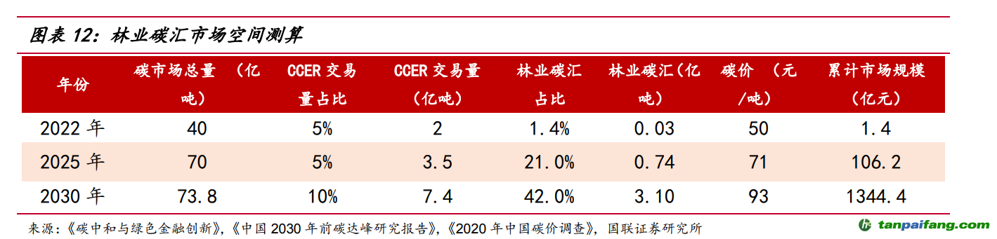 相比之下,目前我國林業(yè)項(xiàng)目碳匯占比僅為1.4%,遠(yuǎn)低于國際林業(yè)項(xiàng)目簽發(fā)量占比42%,林業(yè)碳匯重要性凸顯,有望成為貢獻(xiàn)CCER項(xiàng)目減排量的主要來源。在2030年我國林業(yè)碳匯市場規(guī)模有望達(dá)到1344億元。