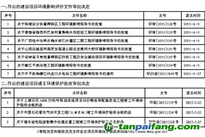根據(jù)建設(shè)項(xiàng)目環(huán)境影響評(píng)價(jià)審批程序和建設(shè)項(xiàng)目竣工環(huán)境保護(hù)驗(yàn)收管理的有關(guān)規(guī)定,經(jīng)審查,2015年6月1日~2015年6月15日我部對(duì)7個(gè)建設(shè)項(xiàng)目環(huán)境影響評(píng)價(jià)文件和3個(gè)建設(shè)項(xiàng)目竣工環(huán)境保護(hù)驗(yàn)收申請(qǐng)作出審批決定。現(xiàn)將作出的審批決定予以公告,公告期為2015年6月16日~2015年6月22日(7日)。 禸嫆@唻洎:狆國(guó)湠棑倣茭昜蛧 τāńpāīfāńɡ.cōm