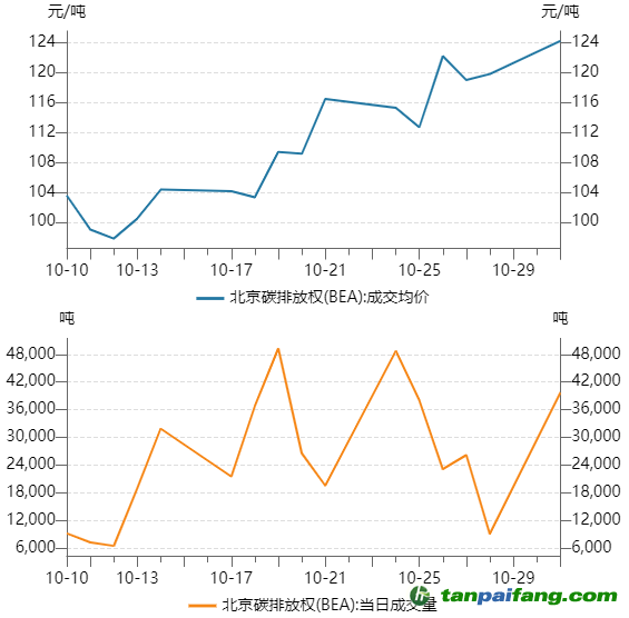 10月北京碳市場碳排放配額(BEA)總成交量41.20萬噸,總成交額4596.28萬元,成交均價111.57元/噸。10月最后一個交易日成交均價124.20元/噸,較9月最后一個交易日上漲15.69%,較10月首個交易日上漲19.95%。截至10月31日,BEA累計成交量1744.01萬噸,累計成交額11.34億元。