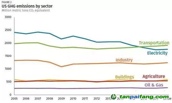 交通運輸連續(xù)3年成為美國最大的排放源。電力部門排放量在連續(xù)五年下降之后逐漸上升。自2010年經(jīng)濟從大衰退中復(fù)蘇以來,工業(yè)排放量同比增長最為強勁,而甲烷排放量在石油和天然氣產(chǎn)量擴大的推動下繼續(xù)增長。